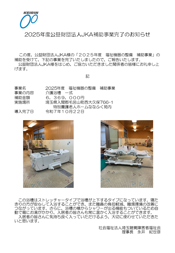 この度、公益財団法人JKA様の「2025年度 福祉機器の整備 補助事業」の補助を受けて、下記の事業を完了いたしましたので、ご報告いたします。