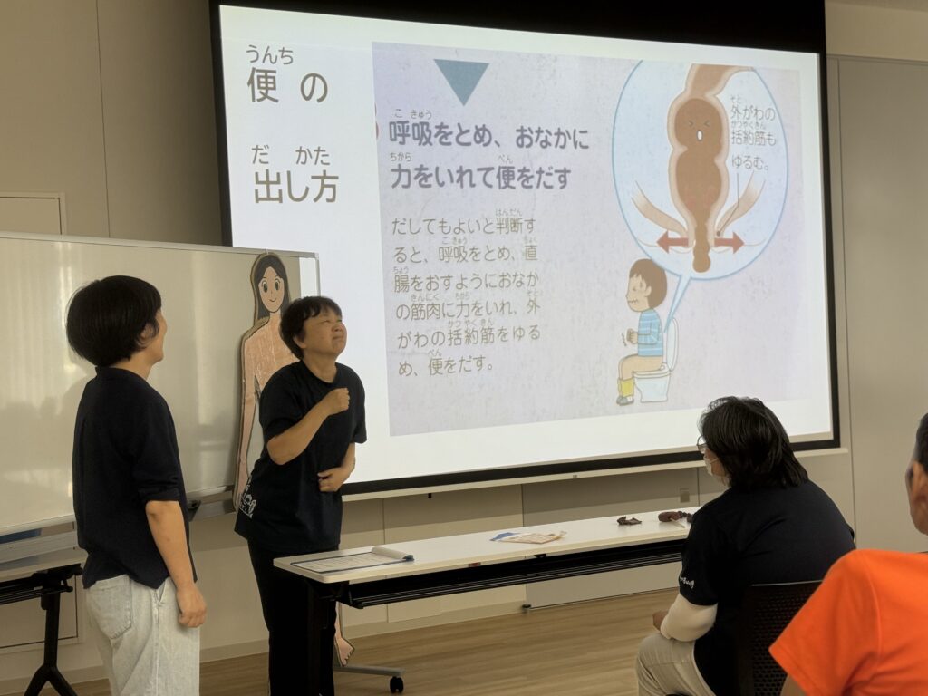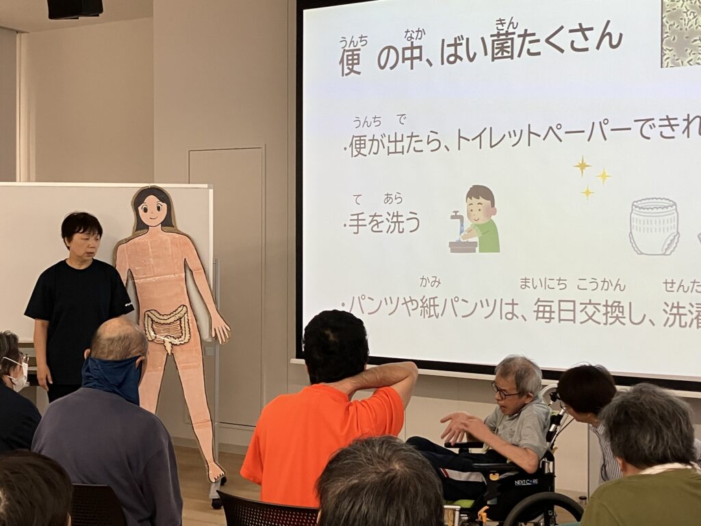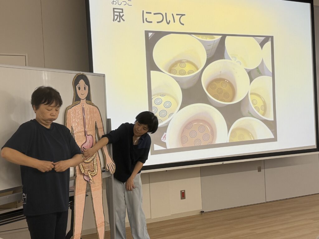 あじさいの会では、仲間たちが中心になって、誕生会や旅行などの企画運営をしていますが、学習会の企画も年に2回おこなっています。今回は、便と尿についてです。健康で元気に過ごすためには、しっかり食べて、飲んで、ウンチやおしっこを出して、清潔に過ごす事が大事です。講師は、看護師と仲間の代表で事前に職員と一緒にテーマについて学んでいた仲間のAさんです。