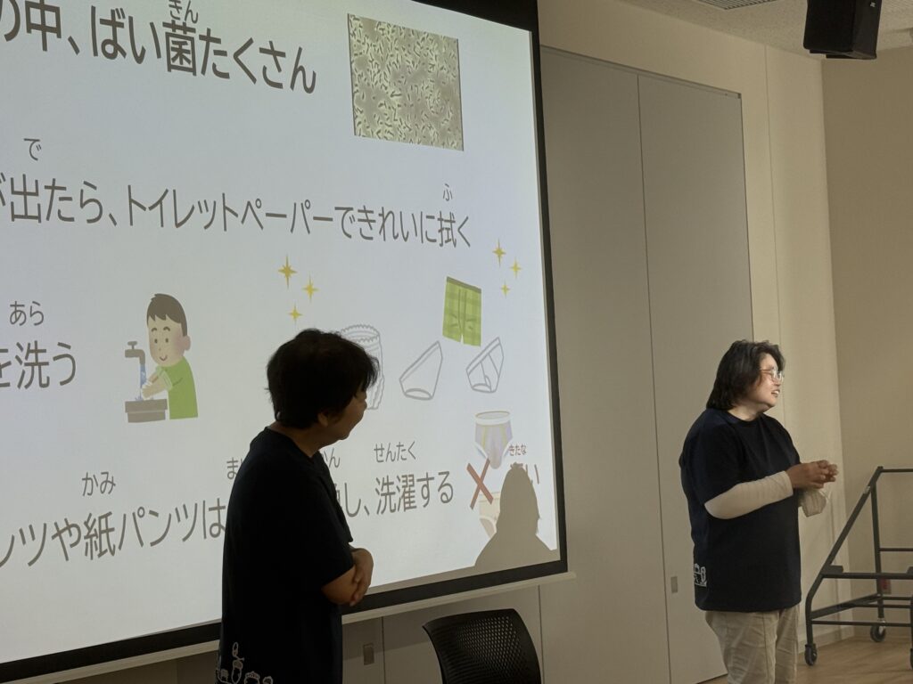 便の模型を作って便の硬さを見たり、尿の色を確認して健康状態を観察したり、大腸菌については、体を清潔に保つことが大事な事など、盛りだくさんの内容でしたが、視覚的にわかりやすい学習材料を事前に準備していて、楽しい学習会となっていました。