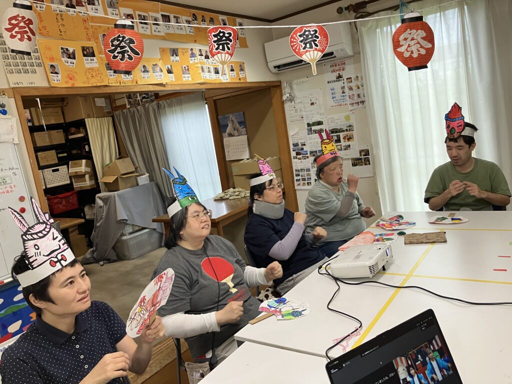 きょうされん盆踊り大会 2025年10月17日 最終更新日時 : 2025年10月13日 春里どんぐりの家 きょうされんの全国の仲間たちと繋がって、オンライン盆踊り大会が開催されました。日頃作業室として使用している場所に、お祭りらしい装飾をして、お面やうちわも作って、踊ったり笑ったりしました。